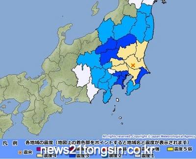 이 지진으로 이바라키현 북부와 남부, 도치기(栃木)현 남부, 사이타마(埼玉)현 북부와 남부, 지바(千葉)현 북서부에 진도 4의 강한 흔들림이 감지됐다.