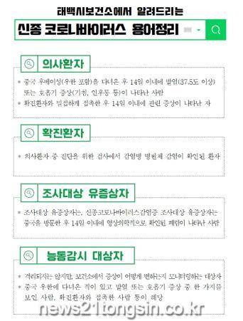태백시보건소(소장 김미영)는 신종 코로나바이러스 국내 확진환자 증가 추세에 따라 방역을 확대 실시하고 있다고 밝혔다.