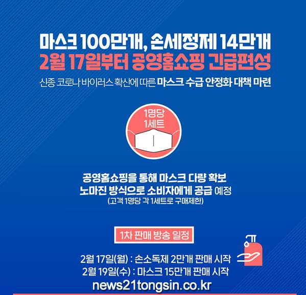공영홈쇼핑은 신종 코로나 바이러스 감염증 확산에 대한 우려가 커지면서 품귀 현상을 빚고 있는 마스크와 손소독제 판매방송을 긴급 편성해 마스크 100만 개, 손세정제 14만 개를 확보해 17일부터 판매방송을 시작한다.