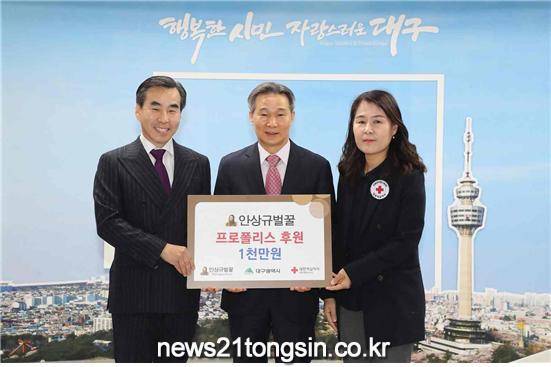 (대구=뉴스21통신) 유재원기자 = 대구시는 11일 오전 대구시청에서 ㈜안상규벌꿀로부터 1천만원 상당의 프로폴리스 106병을 전달받았다.