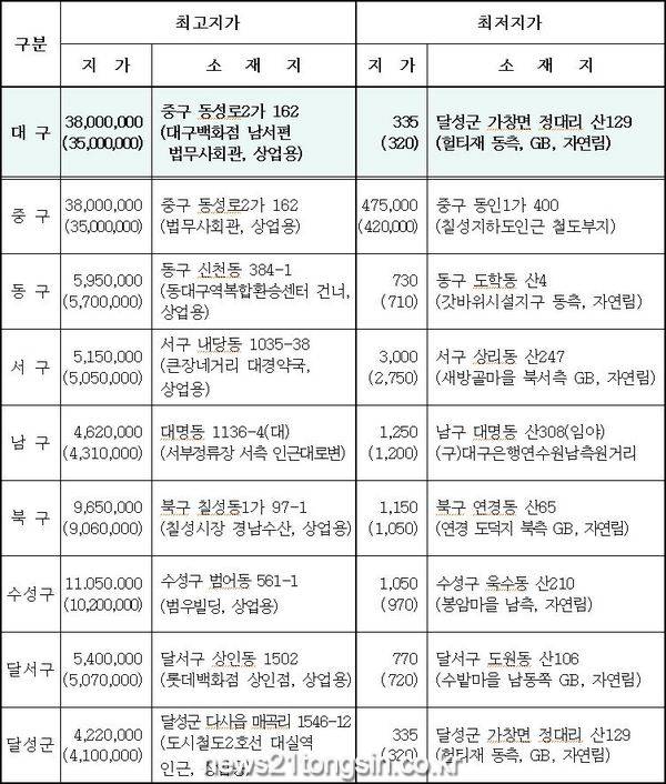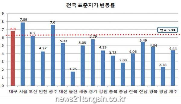 (대구=뉴스21통신) 유재원기자 = 국토교통부가 올해 1월 1일 기준으로 조사·평가해 13일 결정·공시한 표준공시지가에서 대구(13,056필지)는 6.80% 상승한 것으로 나타났다.