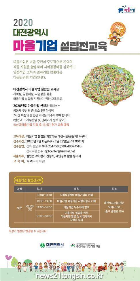 대전시는 오는 28일까지 마을기업 설립을 희망하는 대전시민(법인, 단체, 공동체 등)을 대상으로 2020년 대전시 마을기업 설립 전 교육 참가자를 모집한다고 13일 밝혔다.