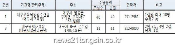 코로나19 확진자의 다수 발생에 따라 자가격리자 중 임시생활시설(격리시설) 이용자 증가가 예상되나 현재 대구시 자체 시설로는 부족하고 추가 자가격리자 수용을 위하여 국가・공공기관 임시생활시설 추가 확보가 필요한 상황이다.