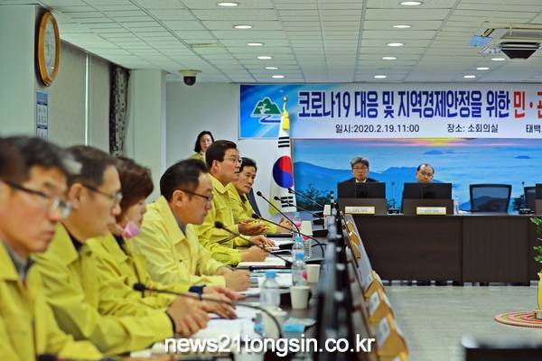 류태호 태백시장은 코로나 19의 지역사회 감염이라는 불안감이 한층 고조된 가운데 열린, 오늘(19일) 민‧관 합동 긴급대책회의에서 “지역공동체를 지키기 위한 노력에 민‧관이 함께 해야한다.”고 강조했다.