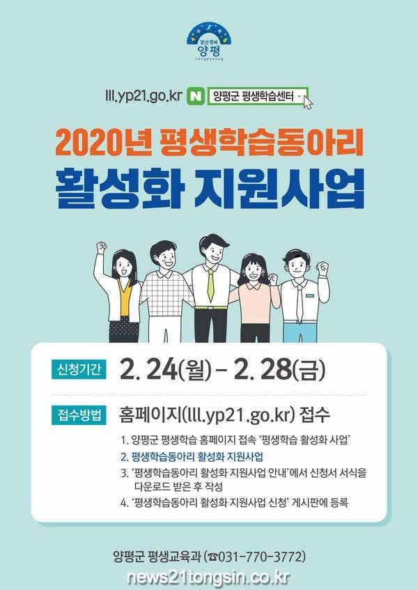 양평군(군수 정동균) 평생교육과는 주도적으로 평생학습을 실천하고 있는 학습동아리를 대상으로 2월 18일부터 28일까지(11일간) ‘양평군 평생학습동아리 활성화 지원사업’ 공모한다고 밝혔다.