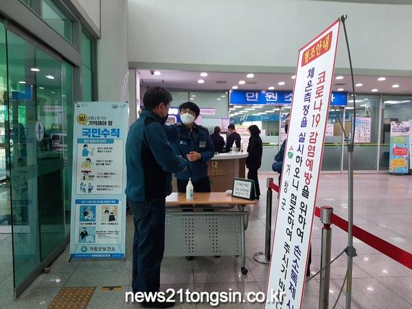지난 24일부터 군은 청사 정문을 제외한 모든 출입문은 폐쇄했고, 공무원과 외부 방문자를 대상으로 손소독제 사용은 물론 발열 체크를 의무적으로 시행하고 있으며, 예방안전 수칙 준수와 마스크 착용을 안내 했다.