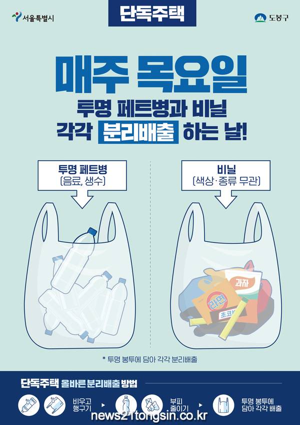 도봉구(구청장 이동진)는 무색 페트병을 고품질 재생 원료로 재활용할 수 있도록, 폐비닐 및 투명 페트병을 다른 재활용품과 별도로 분리해 버리는 ‘폐비닐·폐페트병 별도 분리배출 요일제’를 시행한다.