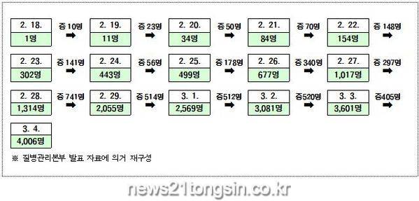 (대구=뉴스21통신) 유재원기자 = 질병관리본부의 공식 발표에 따르면 3월 4일 오전 0시 현재, 대구시에서 발생한 코로나19 확진환자는 전일 오전 0시 대비 405명이 증가한, 총 4,006명이다.