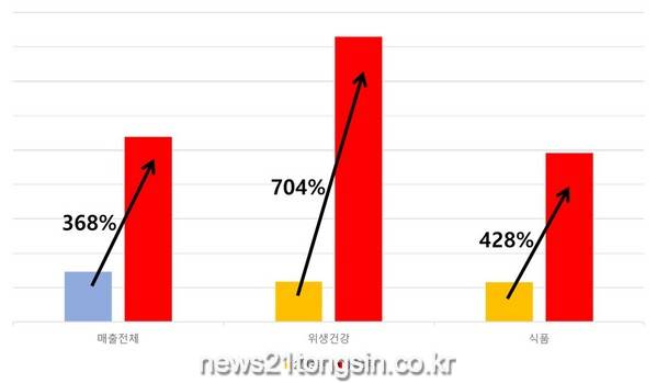 위생건강 카테고리 매출이 704%로 가장 큰 폭으로 증가했다. 마스크, 손소독제, 공기청정기 필터, 면역강화 관련 제품 등의 구매가 급증했다.
