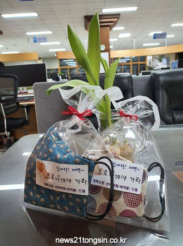 태백시청 여직원 모임인 산목련회(회장 김해경)는 오늘(11일) 관내 3개 요양원에 직접 제작한 면 마스크 120개를 전달했다고 밝혔다.