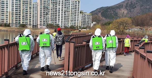 (대구=뉴스21통신) 박창남기자 = 달서구는 501여단 달서구대대(대대장 김원일)에서 지난 13일 오후 2시 월광수변공원, 월곡역사공원 일원에서 장병 25명이 참여하여 코로나19 감염병 예방 및 확산방지를 위한 방역을 했다고 밝혔다.