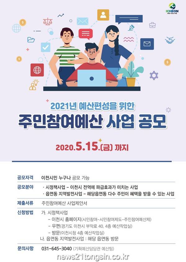 이천시는(엄태준 시장) 2021년도 예산편성을 위한 주민참여예산 제안사업을 3월 16일부터 5월 15일 까지 두 달간 공개 모집한다.