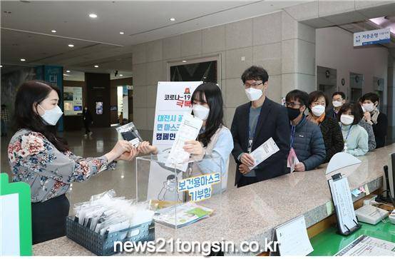 대전시 공직자들이 코로나 19의 장기화로 인한 보건용 마스크 공급 부족 해소를 위해 공무원 자투리나눔기금을 활용해 면 마스크 착용 캠페인과 보건용 마스크 기부활동에 나선다.
