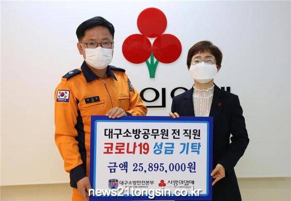 (대구=뉴스21통신) 유재원기자 = 대구소방안전본부는 코로나19 확산으로 인한 고통 분담과 위기극복을 위해 3월 19일 성금 25,895,000원을 사회복지공동모금회(대구지회)에 전달했다.
