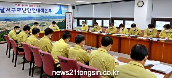 (대구=뉴스21통신) 박창남기자 = 달서구는 3월 19일 오전 9시 코로나-19의 다중이용시설 확산방지를 위한 긴급 대책회의를 개최, 코로나-19 대응 추진상황을 일제점검하고 확산방지를 위한 최선의 노력을 당부하였다.