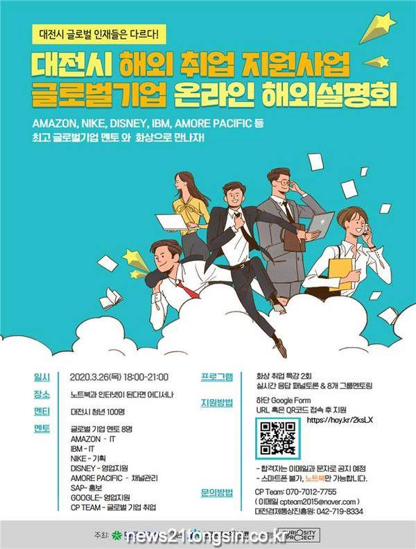 대전시는 오는 26일 오후 6시부터 많은 기업들이 화상회의에 이용하는 프로그램(zoom)을 활용해 구직자들에게 실시간 온라인 취업강의를 진행하는 ‘글로벌기업 온라인 해외설명회’를 진행한다고 23일 밝혔다.