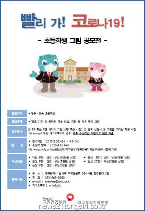(대구=뉴스21통신) 유재원기자 = 국민건강보험공단 대구·경북지역본부는 3월 26일부터 4월 8일까지 코로나19 극복 그림 공모전 ‘빨리 가! 코로나19!’를 개최한다고 밝혔다.
