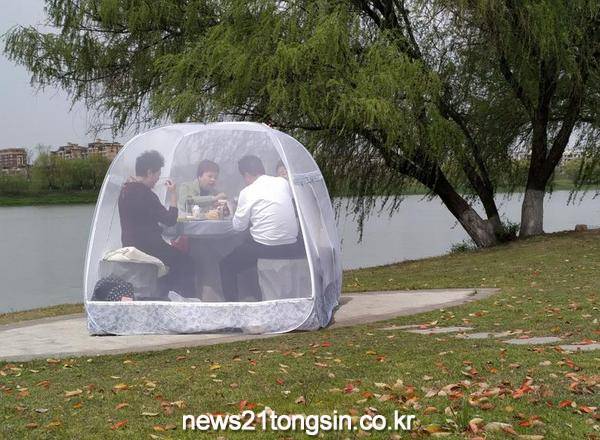 중국 장쑤성 난징에있는 한 공원에서 중국인들이 코로나 바이러스를 막기 위해 텐트 안에서 식사를 즐기고 있다.