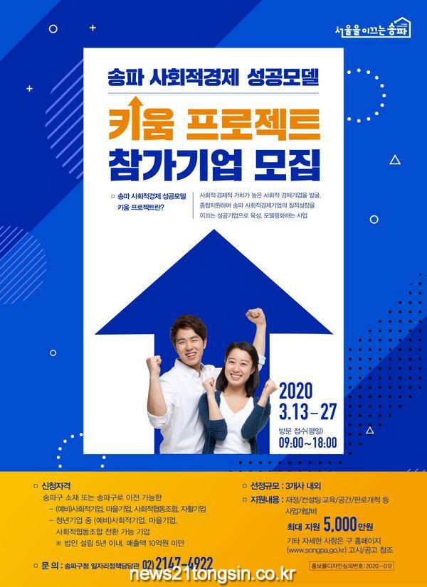 송파구(구청장 박성수)가 ‘송파 사회적경제 성공모델 키움 프로젝트’에 참가할 기업을 오는 27일까지 모집한다.