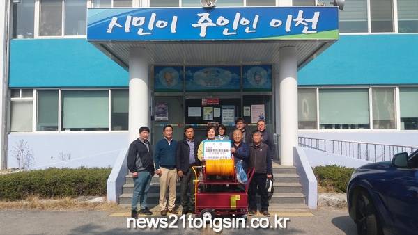 서이천로타리클럽(회장 김영수)은 25일 코로나 19 지역 확산 방지를 위해 사용해 달라며 엔진밀차형 소독용고압분무기를 마장면에 기탁하였다.
