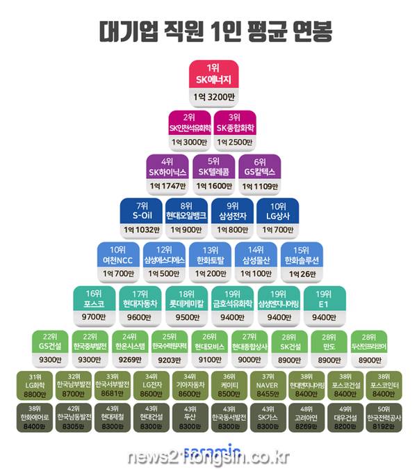 직원 1인당 평균 급여가 가장 높은 기업은 ▲SK에너지로 1억 3,200만원을 지급했다. 이어서 ▲SK인천석유화학(1억 3,000만원) ▲SK종합화학(1억 2,500만원), ▲SK하이닉스(1억 1,747만원) ▲SK텔레콤(1억 1,600만원) 순으로 SK그룹 계열사들이 상위 1위부터 5위까지를 석권했다.