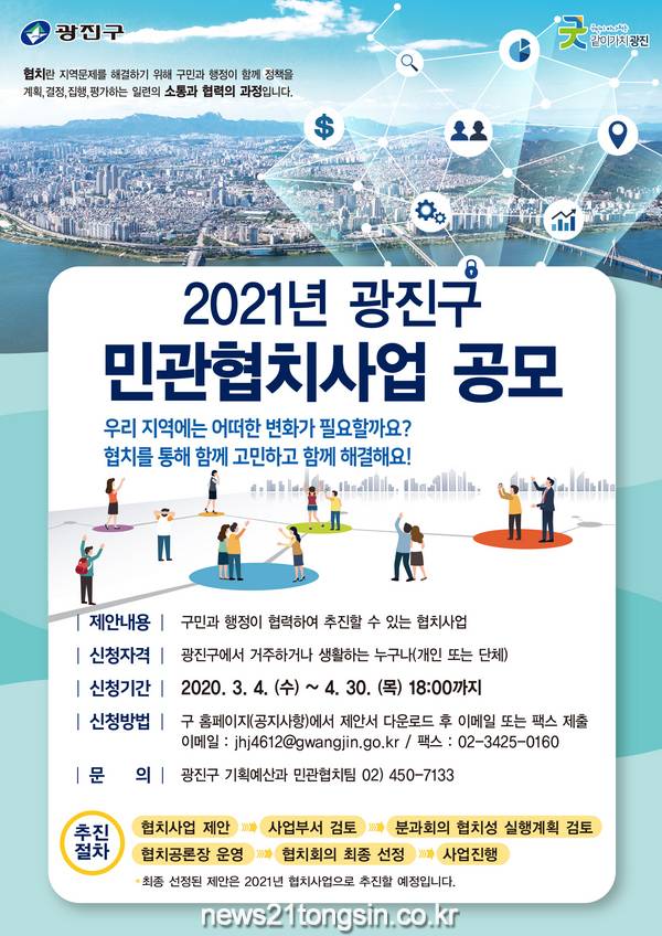 광진구(구청장 김선갑)가 정책 결정의 모든 과정에 구민이 직접 참여할 수 있는 2021년 광진구 민관협치 사업 공모에 나섰다.