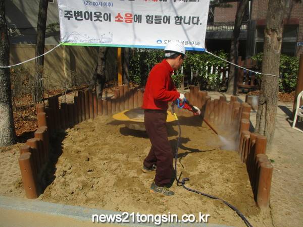특히 지난해 하반기부터는 소독 횟수를 늘리기 위해 증기살균 장비를 직접 구매하여 자체 모래놀이터 소독 전담팀을 구성해 반기별 1회 수시소독을 실시하였으며, 수시 살균작업을 통해 지역주민들로부터 좋은 호응을 얻었다. 또 고온스팀방식 소독으로 기존의 모래를 뒤집어 살균하는 방식보다 소독효과가 탁월하다. 올해부터는 분기별 1회로 수시소독을 강화할 예정이다.
