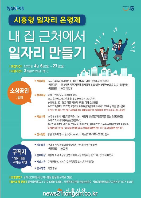 이번 사업은 시흥시 소재 1~4명 근로자를 둔 소상공인 1,000개 업체와 구직자 1,000명을 대상으로 한다. 소상공인이 구직자를 채용해 1일 6시간 근무하면, 4시간에 대한 인건비는 시가 지원하는 내용이다. 5월 이후 사업장별로 근로를 개시한 날로부터 3개월간의 인건비를 지원한다.