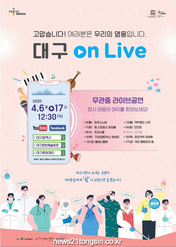 (대구=뉴스21통신) 유재원기자 = 대구시와 대구문화재단에서는 코로나19 종식을 위해 최전선에서 고군분투하는 의료진 및 관계자들을 응원하기 위한 온라인 공연을 추진한다.
