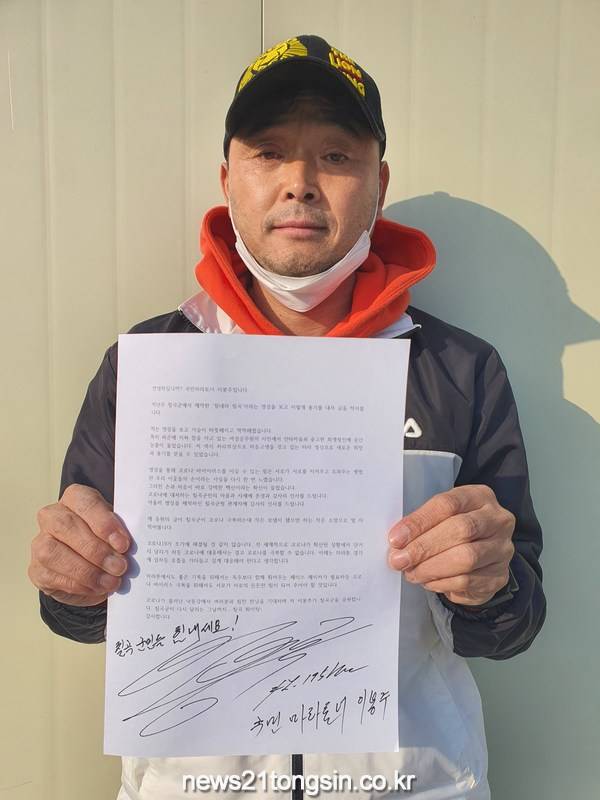 (경북=뉴스21통신) 유재원기자 = 국민 마라토너인 이봉주 전 선수가 보건의 날을 맞아 칠곡군과 보건소 직원에 보내온 코로나 응원편지가 눈길을 끌고 있다.