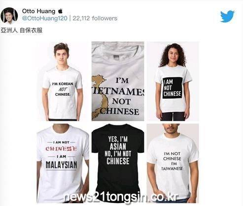 최근 코로나19 여파로 일부 서구 국가에서 발원지인 중국에 대한 반감이 커지고 있는 가운데 최근 한 트위터에 "아시아인이 자신을 스스로 보호하기 위한 옷"이라는 글과 함께 여러 장의 티셔츠 사진이 게재됐다.