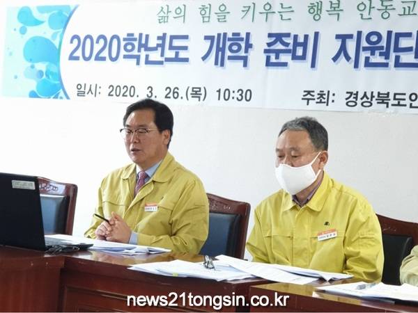 경상북도안동교육지원청(교육장 권덕칠)은 3월 26일(목) 오전 10시 30분에 안전한 개학을 위하여 교육지원청 관계자, 유․초․중등 관리자, 영양, 보건, 담임교사 20여명으로 구성된 개학 지원단을 구성하여 화상 협의회를 실시하였다.