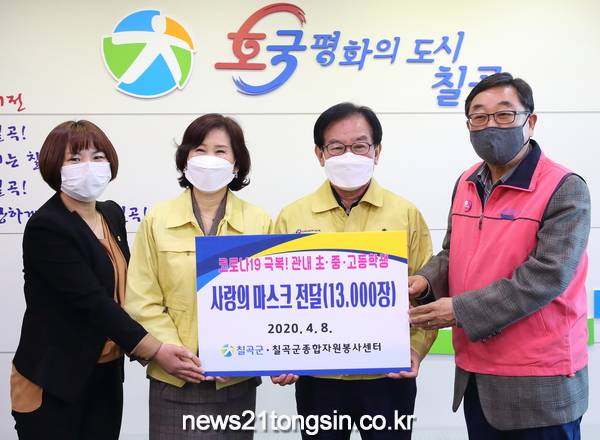 (경북=뉴스21통신) 유재원기자 = 칠곡군은 지난 9일 관내 모든 초중고 학생에게 1인당 1장씩 전달해 달라며 마스크 1만 3천장을 칠곡교육지원청에 전달했다.