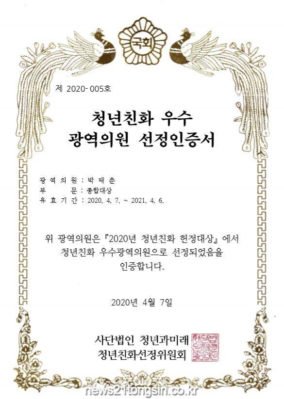 아울러 청년친화 우수광역의원은 청년관련 조례 제정 및 개정, 청년들과의 소통 활동을 중점으로 평가해 선정되었으며 경북에서는 박태춘 도의원이 유일하게 청년친화 우수 광역의원으로 선정이됐었다. 박태춘의원은 "앞으로도 청년들이 살고 싶은 경북이 될 수 있도록 열심히 의정활동을 하겠다"고 말했다.
