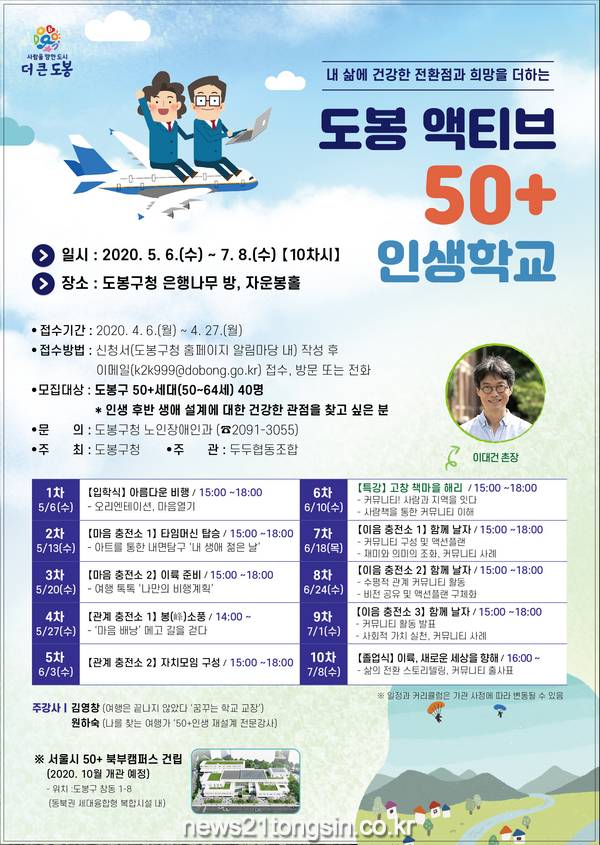 이동진 도봉구청장은 “이번 인생학교 교육이 점차 증가하고 있는 50+세대의 제2의 인생설계에 도움이 되기를 바라며, 교육 이후에도 지역사회와의 연계활동으로 이어져 지역 안에서 가치를 찾고 나눔을 실천할 수 있기를 희망한다.”고 말했다.