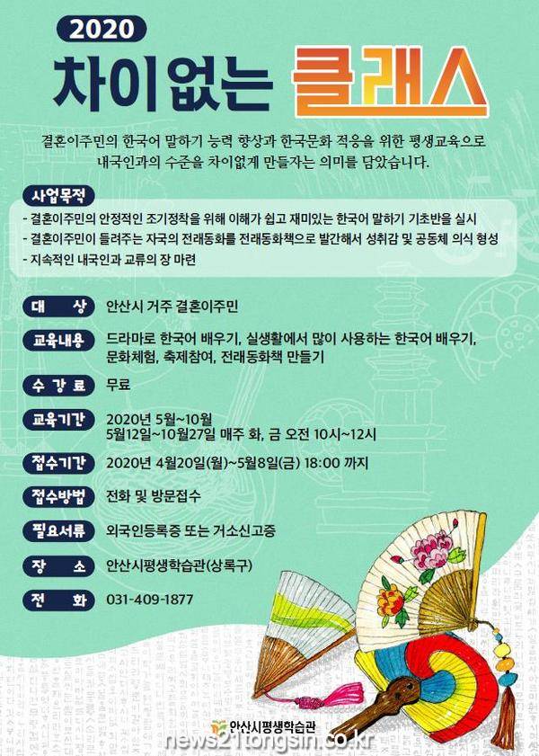 안산시(시장 윤화섭) 평생학습관은 상록구 지역에 거주하는 결혼이주민을 대상으로 특수목적 한국어 교육 및 문화예술체험, 내국인과의 연계활동 프로그램인 ‘차이 없는 클래스’ 프로그램 수강생을 모집한다고 13일 밝혔다.