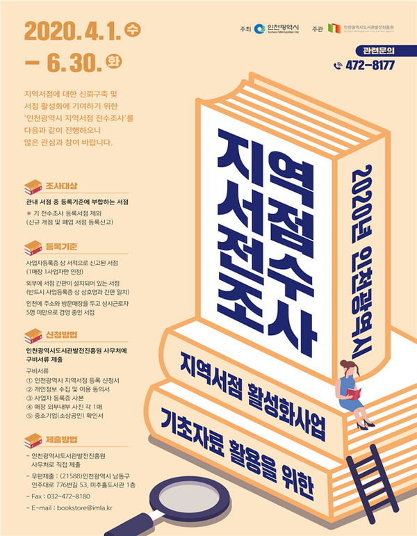 이번 지역서점 전수조사 신청과 관련한 자세한 사항은 인천광역시도서관발전진흥원(☎472-8177)으로 문의하면 된다.