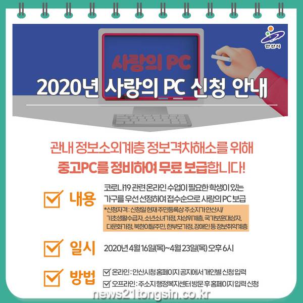 안산시(시장 윤화섭)는 정보소외계층을 위한 ‘사랑의 PC 지원’을 코로나바이러스감염증-19(코로나19) 사태를 맞아 대폭 확대해 추진한다고 14일 밝혔다.