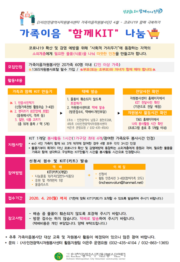 시민 누구나 군·구 자원봉사센터에 신청을 하면 가족이음자원봉사단 자격으로 참여가 가능하며, 각 가정에서 사랑의 꾸러미 면역 키트의 물품을 채워 응원편지와 함께 자원봉사센터로 택배로 보내면 된다.