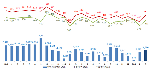 2020년 수출입 현황을 살펴보면 3월 월간 수출입 집계 결과, 전년 동월 대비 수출은 0.7% 감소한 467억 달러, 수입은 0.3% 증가한 421억 달러로, 무역흑자 46억 달러를 기록하여 ‘12.2월 이후 98개월 연속 흑자 달성한것으로 나타났다.