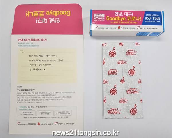 (대구=뉴스21통신) 박창남 기자 = 달서구와 달서구자원봉사센터는 코로나19로 어려움을 겪고 있는 이웃에게 희망메시지와 응원키트를 전달하는 ‘안녕, 대구! 굿바이 코로나’자원봉사운동을 전개한다.