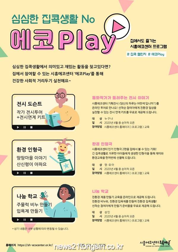 시흥에코센터는 코로나19 사태 장기화 대응을 위한 비대면 환경 교육 프로그램 ‘에코Play’를 운영한다. ‘에코Play’는 비대면 온라인 동영상과 연계 체험활동을 담은 프로그램으로 친환경 실천 주제를 강조하고 있다.