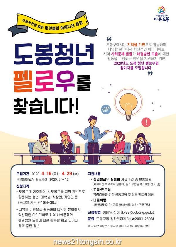 도봉구(구청장 이동진)가 공공문제 해결을 위해 사회혁신 활동을 수행중이거나 계획 중인 도봉구 청년들을 지원하기 위한 ''청년펠로우'' 참여자를 29일까지 모집한다.