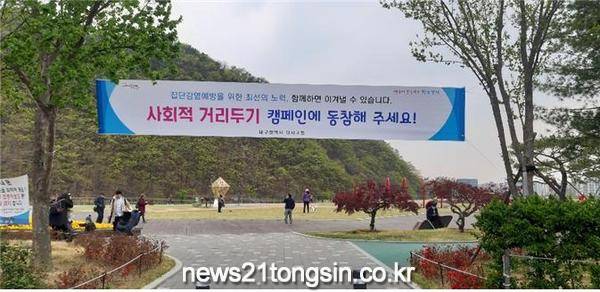 또한, 사회적 거리두기 실천 현수막을 게시하여 시민참여형 방역에 동참하도록 주민 홍보에 집중하고 있으며, 공원을 이용하는 주민이 많은 주말이나 공휴일에도 거리두기 실천을 독려하기 위한 현장 홍보 활동을 진행하고 있다.