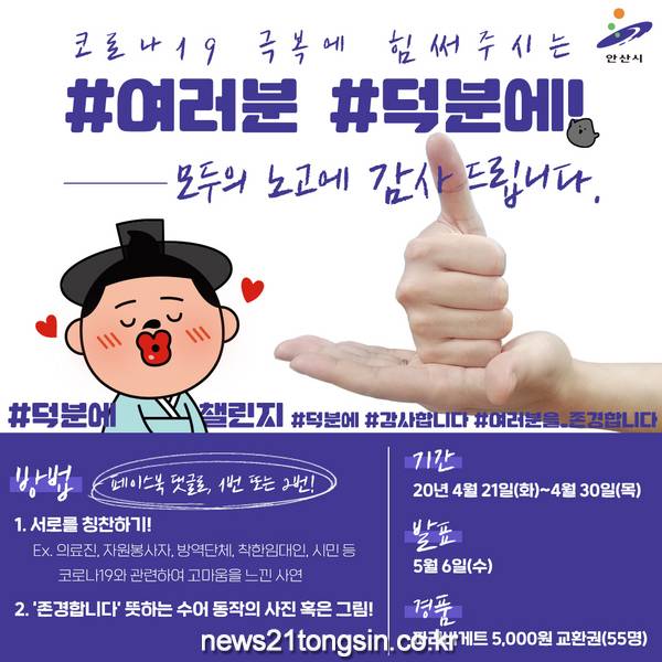 21일 시에 따르면 이날부터 시작되는 캠페인은 오는 30일까지 안산시 공식 SNS 5개 매체에 코로나19 극복을 위한 댓글 또는 칭찬글, ‘존경합니다’를 뜻하는 수어 동작의 사진 또는 그림을 작성하는 방식으로 진행된다.