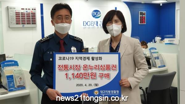 (대구=뉴스21통신) 유재원기자 = 대구지방경찰청은 코로나19로 침체된 지역경제 활성화에 기여하기 위해 1,140만원 상당의 온누리상품권을 구매하여 직원들에게 제공한다.