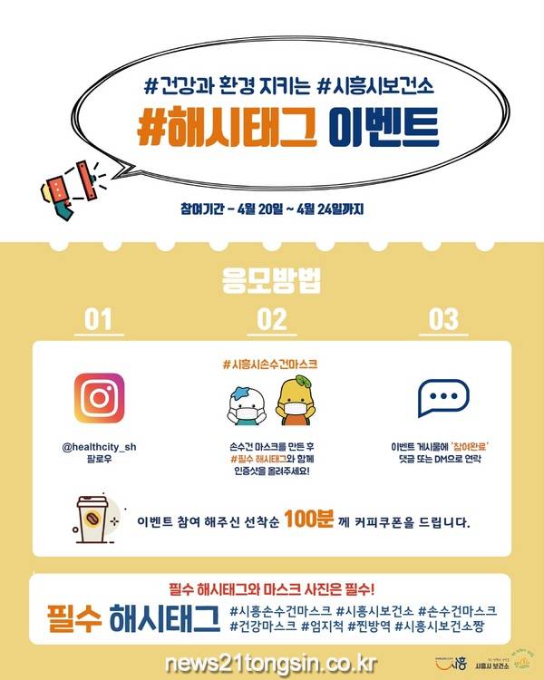 이번 이벤트는 시민 누구나 참여 가능하며, 참여기간은 4월 20일부터 24일까지다. 시흥시보건소 인스타그램을 팔로우하고 손수건마스크를 만든 후 #시흥손수건마스크 해시태그와 함께 인증샷을 올리면 된다. 시흥시보건소 인스타그램 이벤트 게시물에 참여완료 댓글을 남기면 응모가 완료된다. 당첨자는 4월 27일에 인스타그램을 통해 발표한다.