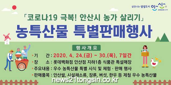 안산시(시장 윤화섭)는 코로나바이러스감염증-19(코로나19) 장기화로 판로 확보의 어려움을 겪고 있는 지역 농가를 돕기 위해 롯데백화점 안산점과 함께 ‘코로나19 극복! 안산시 농가 살리기’ 농특산물 특별판매행사를 개최한다고 22일 밝혔다.