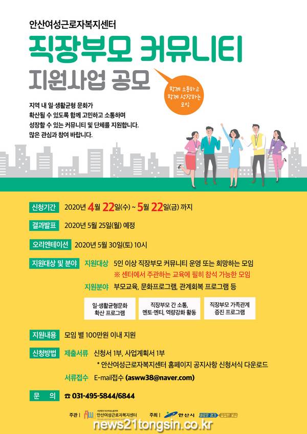 안산여성근로자복지센터는 일과 가정 양립을 응원하고 직장부모 커뮤니티 활성화를 위해 ‘직장부모 커뮤니티 지원사업’을 공개모집 한다고 22일 밝혔다.
