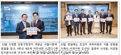 이정훈 강동구청장은 이날 서울시장 집무실에서 진행된 면담에서 강동구민의 염원이 담긴 ‘지하철 9호선 4단계 조기착공 3만인 서명지’를 전달하며 이같이 요청했다.